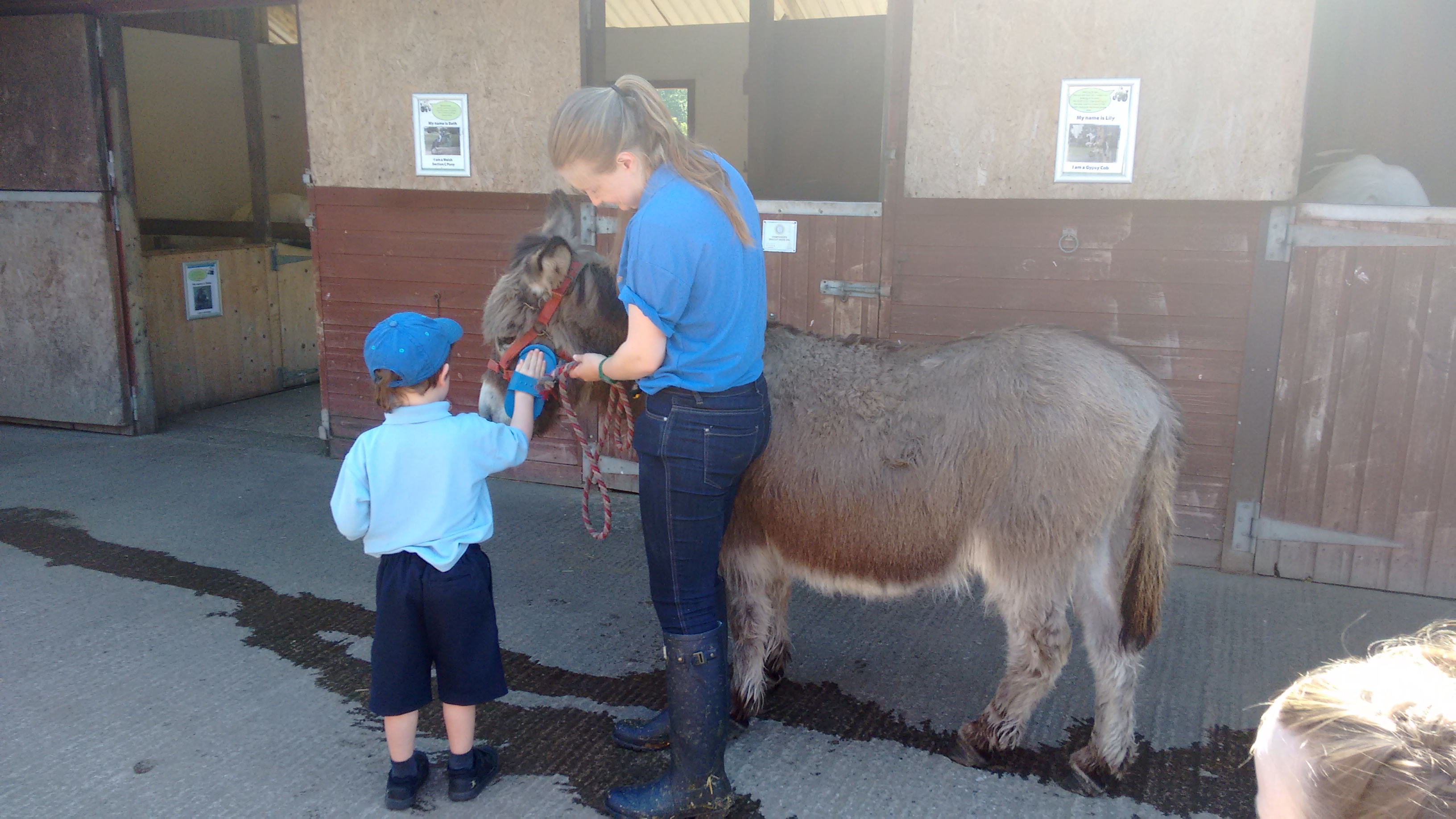 On Monday, Reception visited Stockley Farm. The sun shone and the children had a fantastic time. After snacks and a drink, we learnt about horses, brushed a donkey then went on a tractor ride into the woods for a nature walk. We identified a variety of trees and searched for badger, fox and mole holes. The children found an old tree and attempted to measure its trunk by joining hands around it. Lunch and play was next, followed by feeding chickens, baby goats and a lamb. We saw huge pigs, new born calves and foals then were allowed to stroke a guinnea pig, rabbit and ferret. They were so soft! After that, we had just enough time to have another quick drink and play on a bouncy castle before climbing on the coach, exhausted, to return back to school. What a great day!!!!